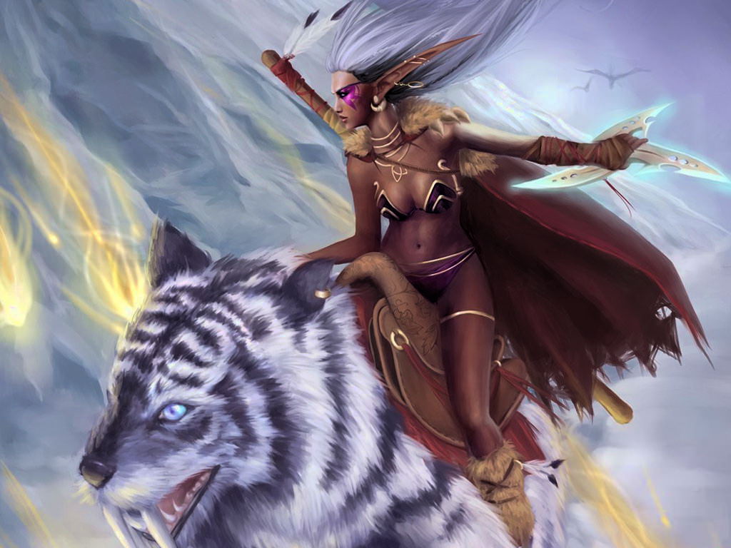 Снежная наездница, девушка с сюрикеном верхом на звере в снежной пустыне.