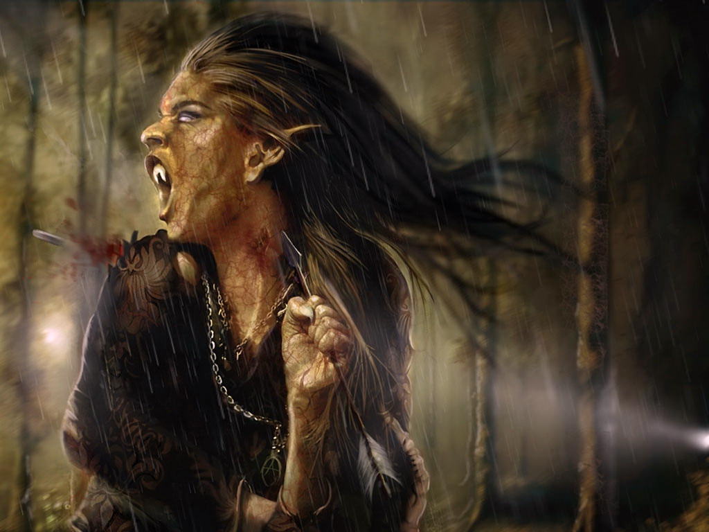 Раненный оборотень, страшная девушка-оборотень со стрелой в руке.