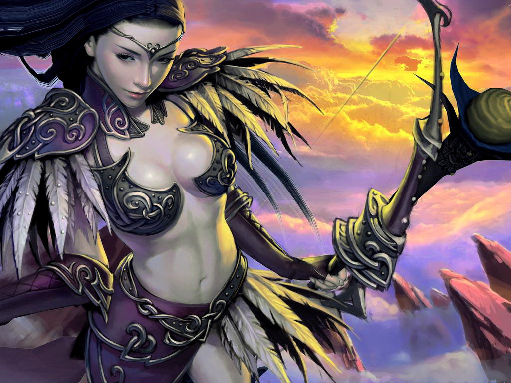 Лучница в перьях, девушка с луком.
