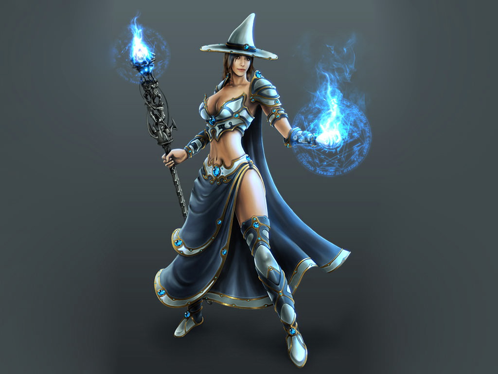 Синее пламя, колдунья, волшебница в магической шляпе, волшебный синий огонь, магический посох, плащ.