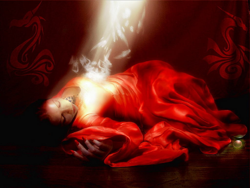 Луч надежды, девушка в красном платье, красные ногти, перья в лучах солнца.
