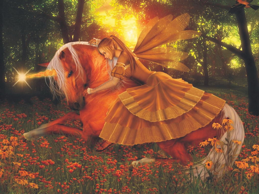 Единорог и фея на поляне с цветами в лесу на закате.
