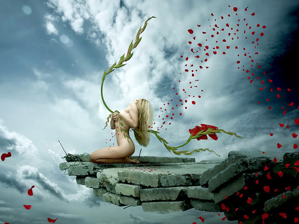 Лепестки по ветру, обнаженная девушка с цветком, облака, на краю пропасти.