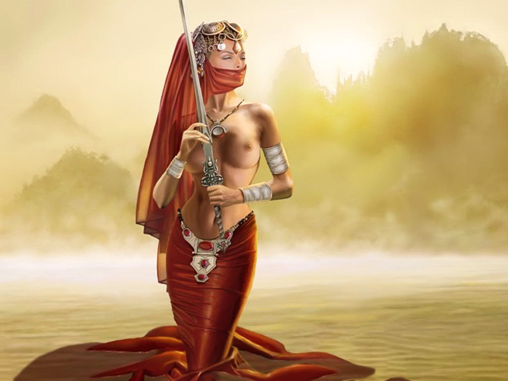 Фэнтези девушка в тумане с обнаженной грудью с мечом.