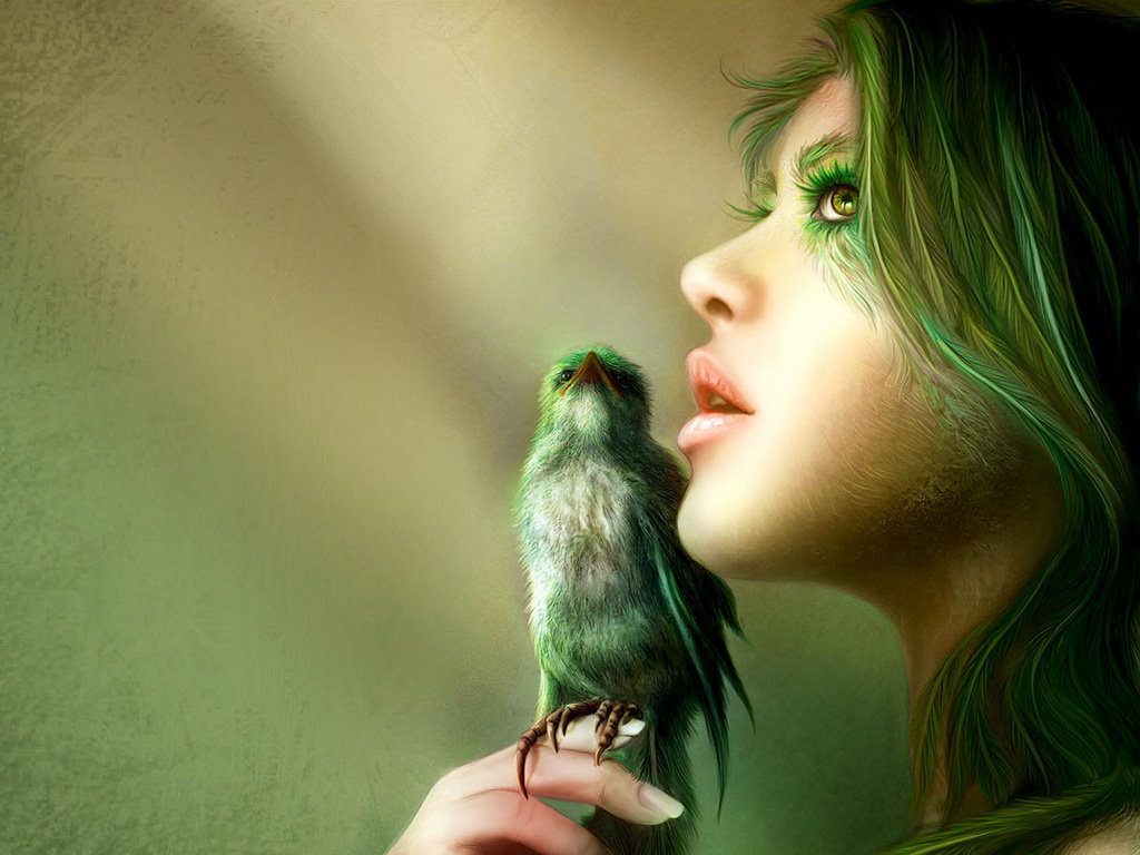 Девушка птица с птичкой, девушка и птица, зеленые глаза.
