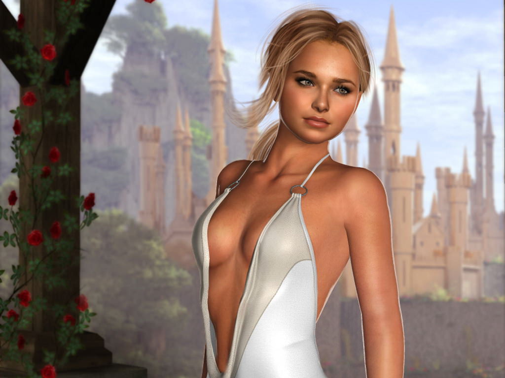 Прекрасная фэнтези девушка с сексуальным декольте, на фоне замка.