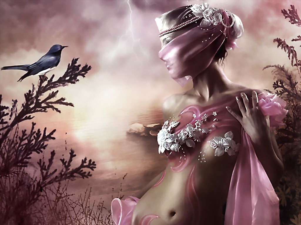 Фэнтези девушка спрятала лицо, фэнтези девушка и птичка.
