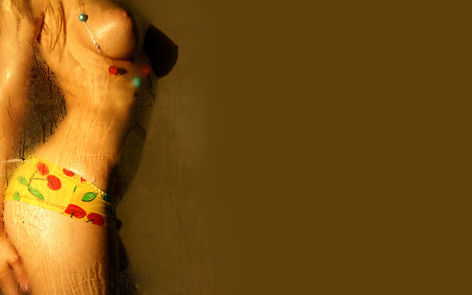 Удовольствие за стеклом, девушка с обнаженной грудью в трусиках стоит мокрая за стеклом.