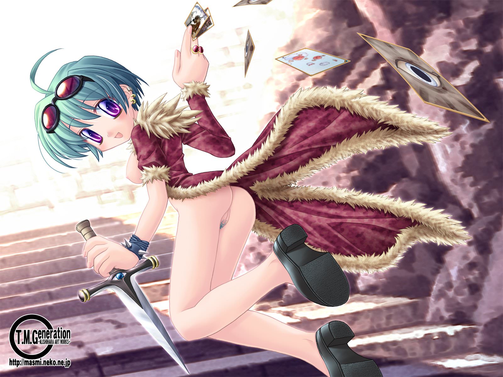 Девочка с картами, девочка с кинжалом без трусиков раскидывает карты по лестнице.