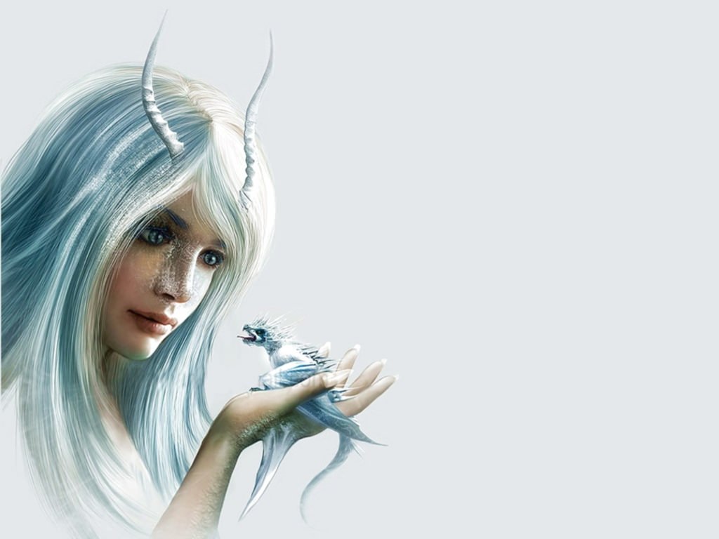 Белоснежная девушка и дракончик, девушка с рогами.