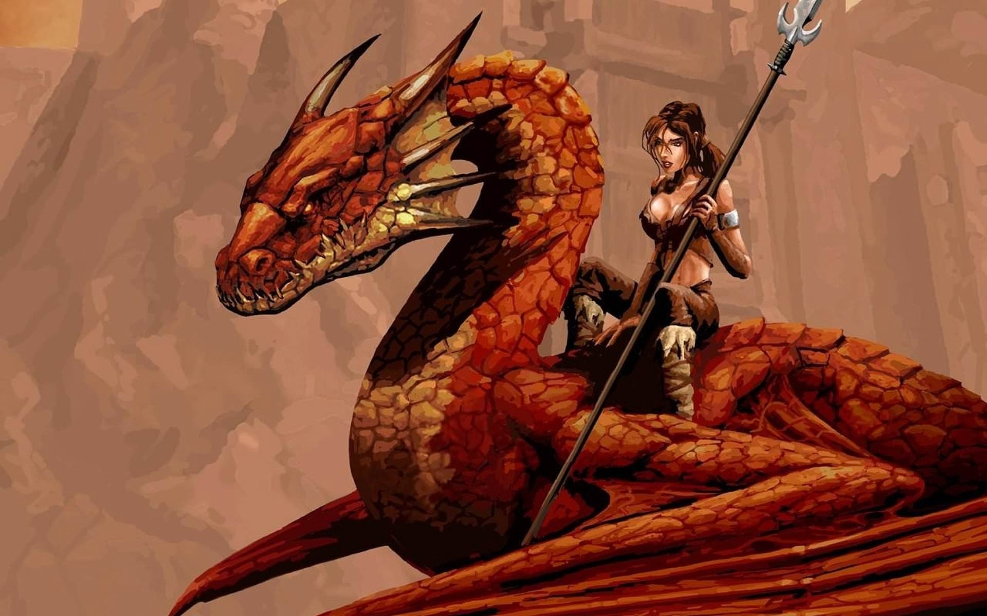 Воительница с копьем на драконе, красный дракон, девушка воин с длинным копьем.
