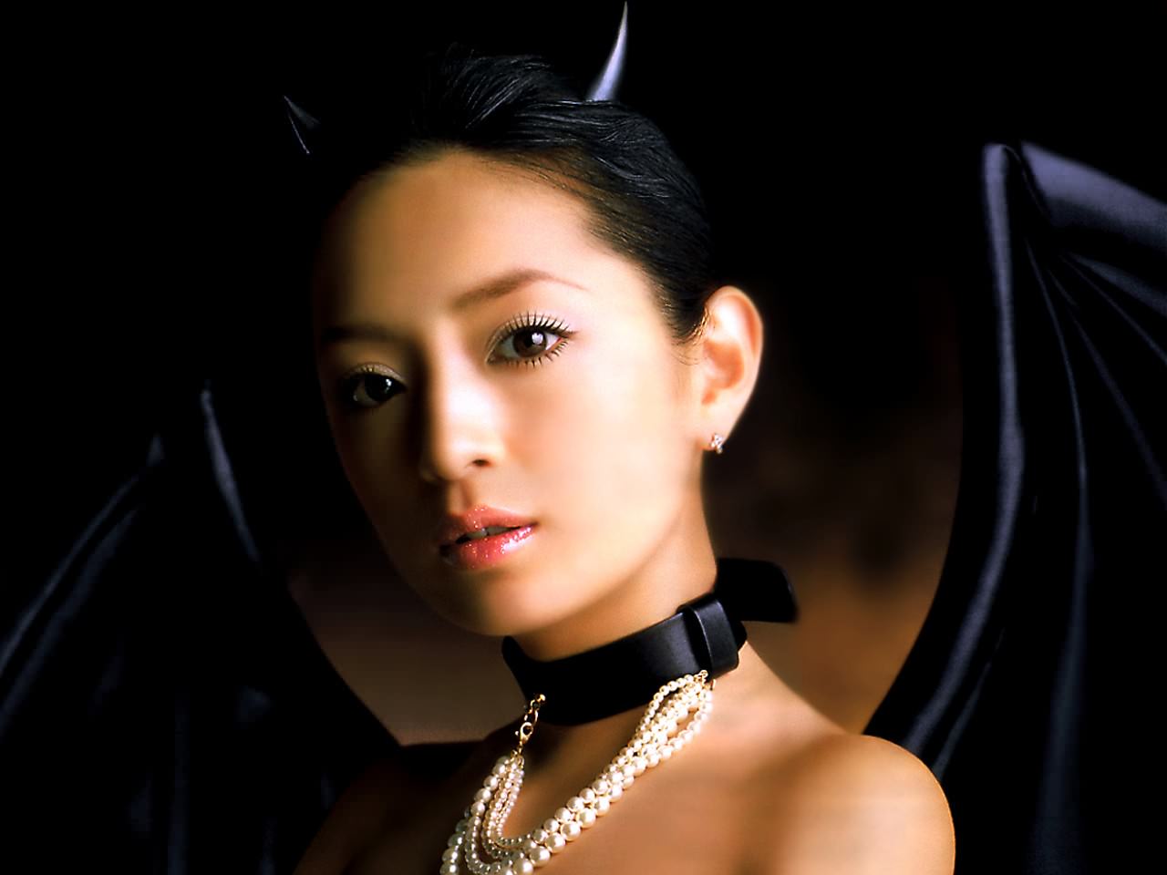 Чертёна, девушка азиатка с черными крыльями с рожками, бусы на шее.