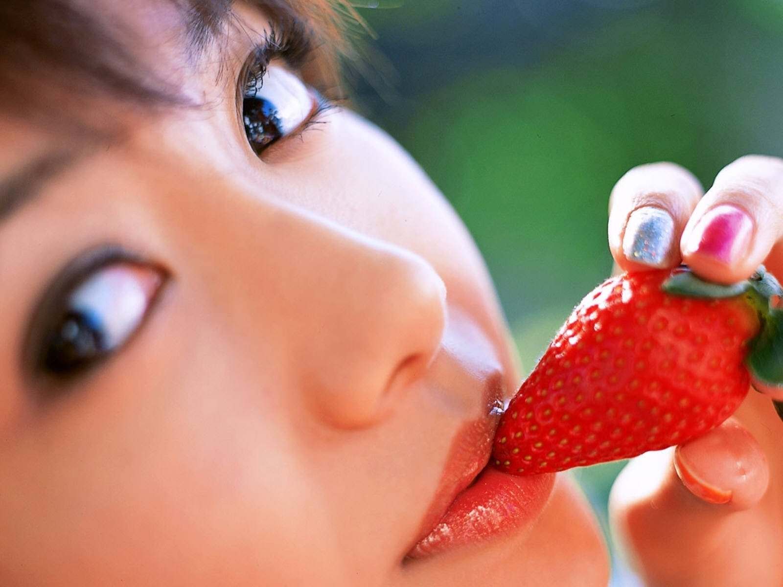 Клубникой по губам, японка проводит клубникой по сладким губам, азиатка и клубника, разноцветные ногти.