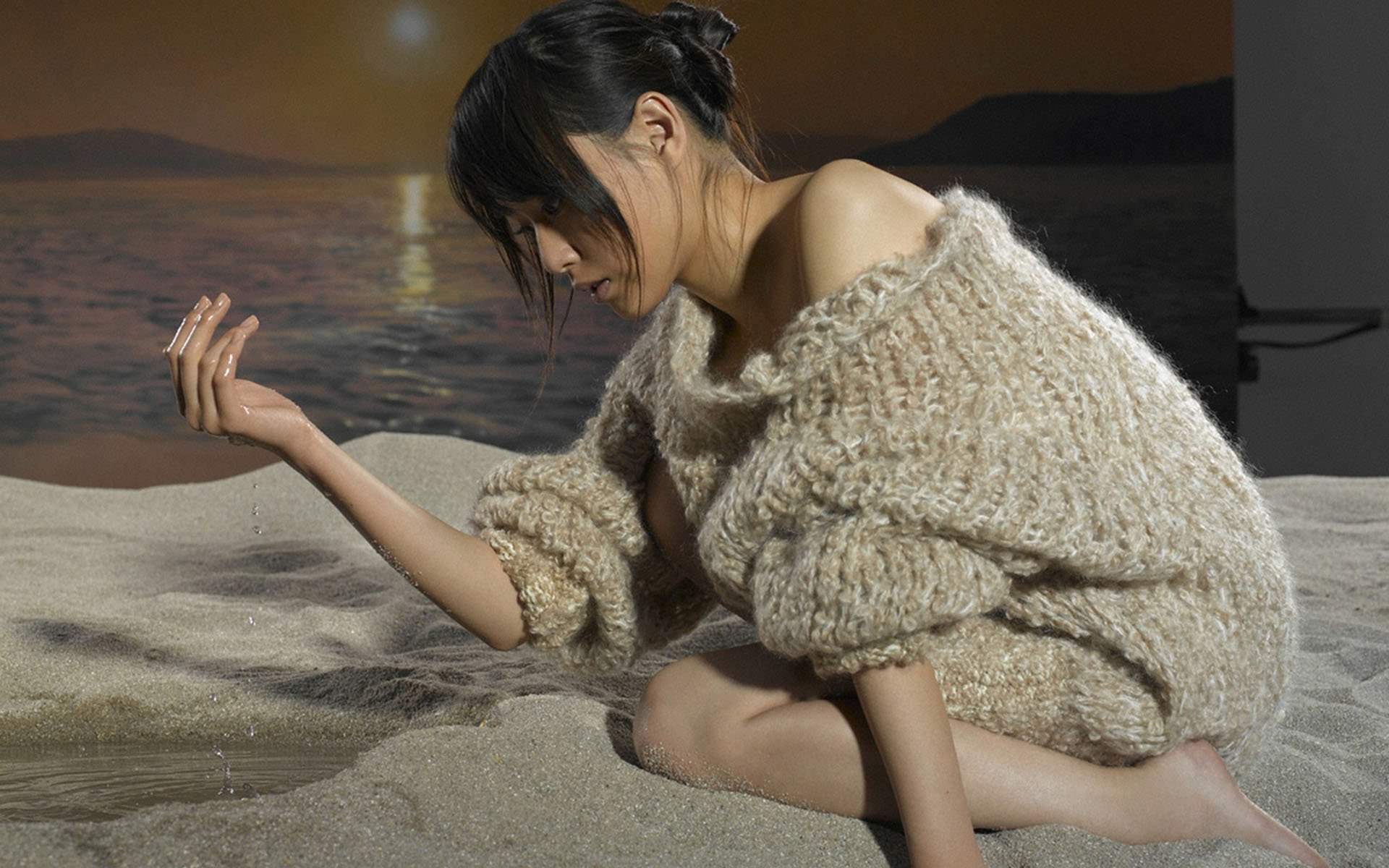 Японка в шерстяной кофте, азиатка на песке, черпает воду.