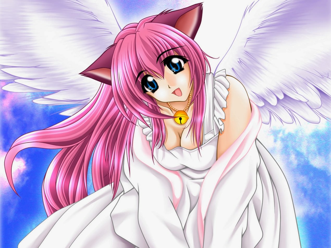 Ангельская принцесса, очаровательная аниме девушка с ангельскими крыльями, в белом платье, с розовыми длинными волосами, с кошачьими ушками, с голубыми глазами, с золотым медальоном на шее, в облаках, прекрасная девушка ангел.