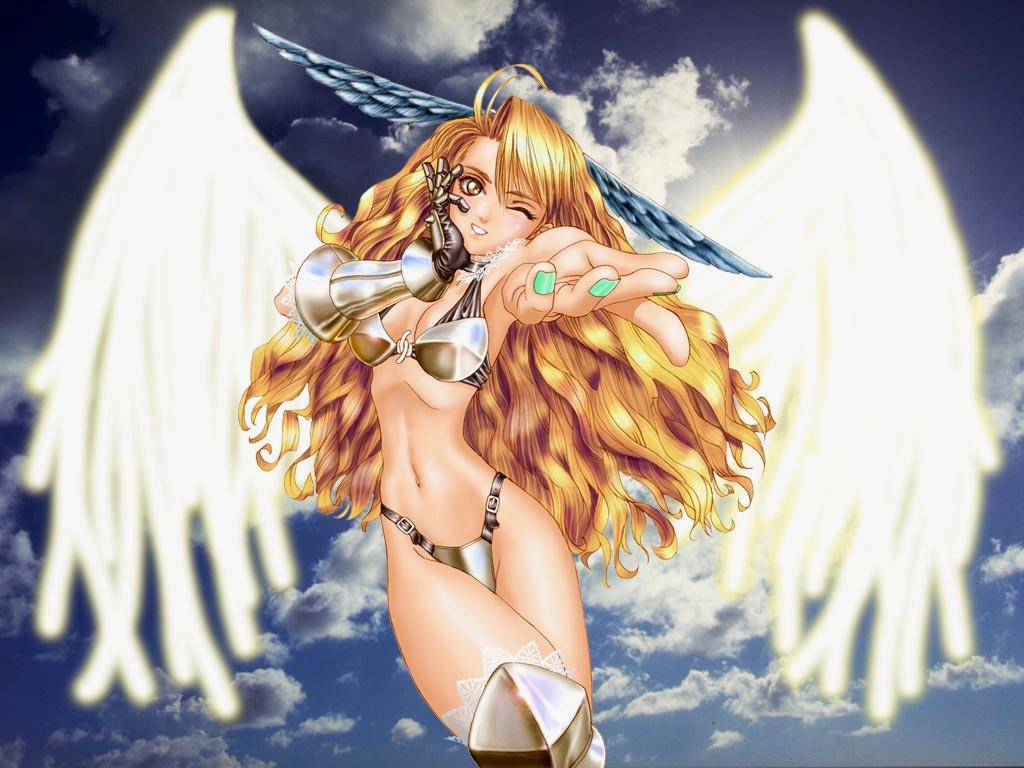 Ангел со светящимися крыльями, прекрасная девушка ангел в облаках манит к себе.
