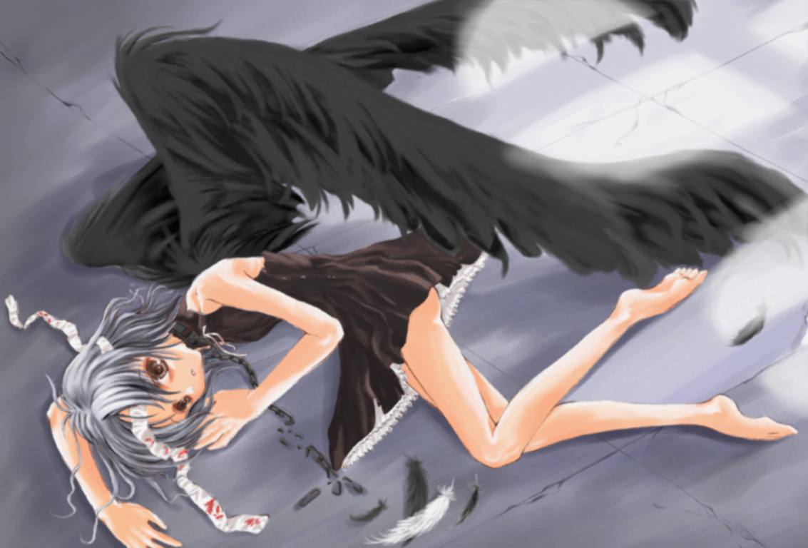Падший ангел с черными крыльями, девочка ангел в платье лежит на земле, кровавая повязка на голове, перья.