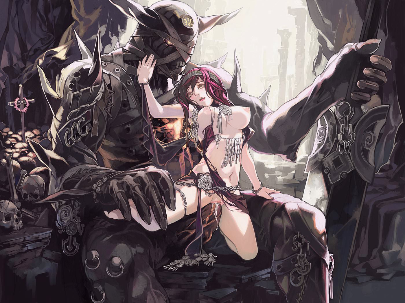 Рыцарь смерти трахает девушку, сидя на камнях с огромным мечом, большой монстр с шипами засунул свой член в голую девушку, которая в разы меньше его, черепа и могилы.