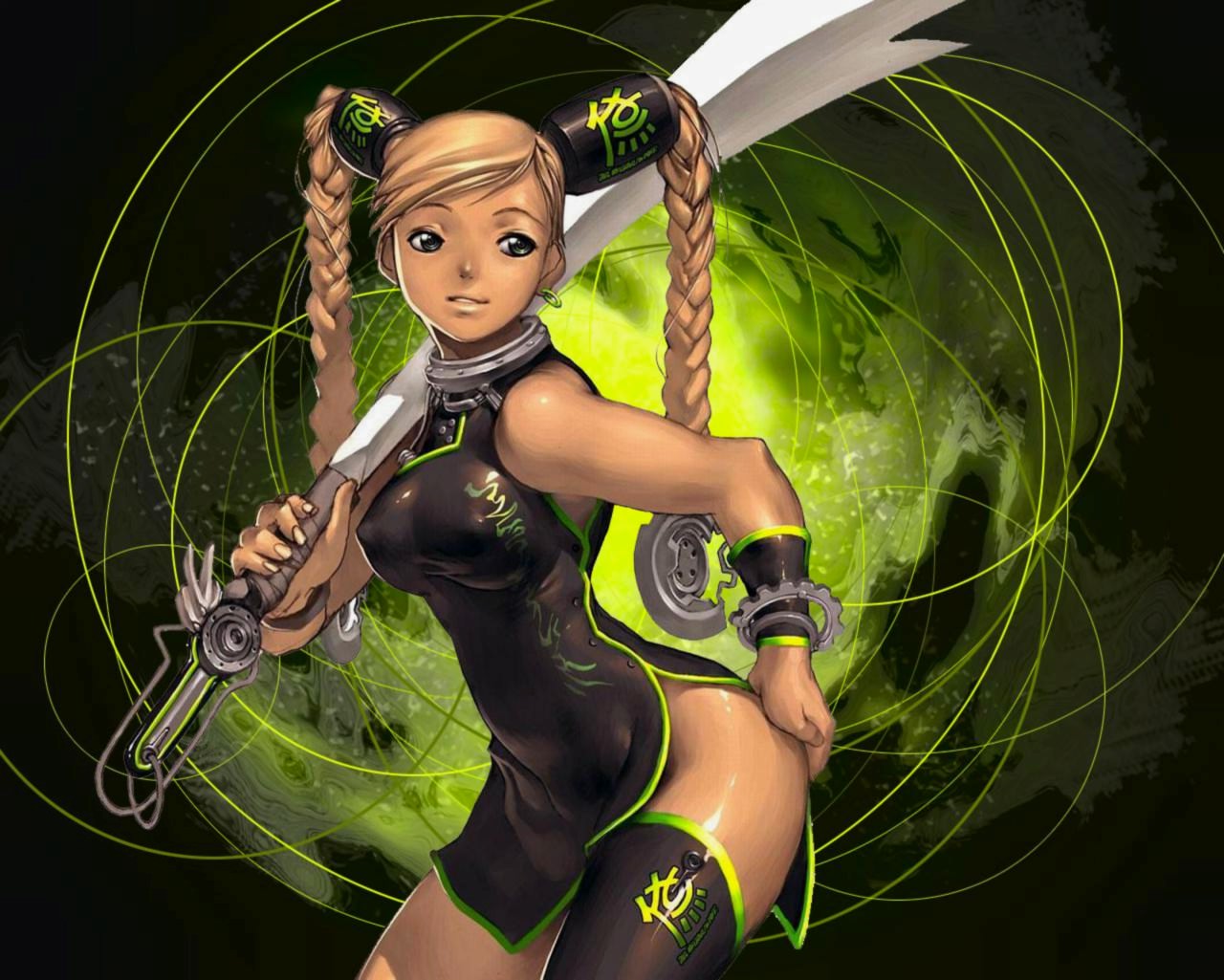 Девушка с мечом трогает свою попу, сексуальная девушка с клинком, упругая грудь под облегающим платьем с вырезами по бокам, рука на попке, лезвия на косичках.