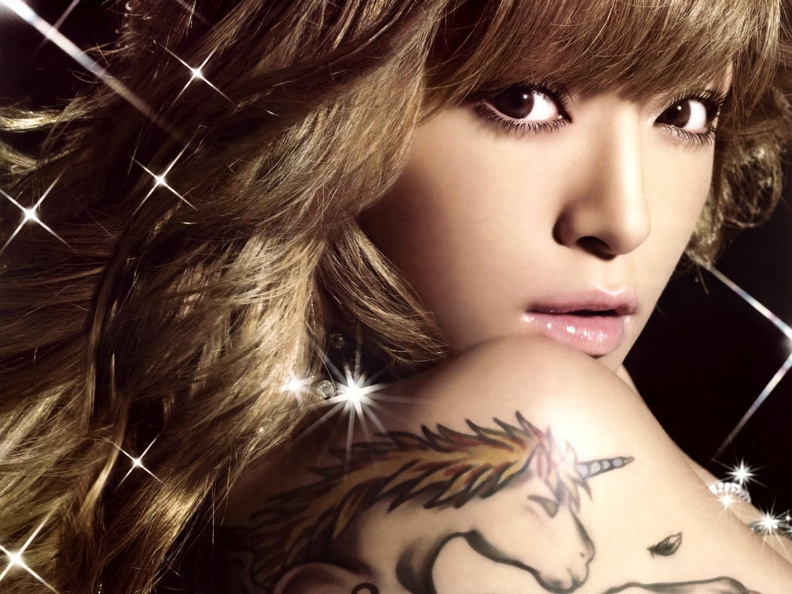 Тату единорога, красивая азиатка с тату на спине и плече, единорог татуировка,сладкие розовые губы и карие глаза.