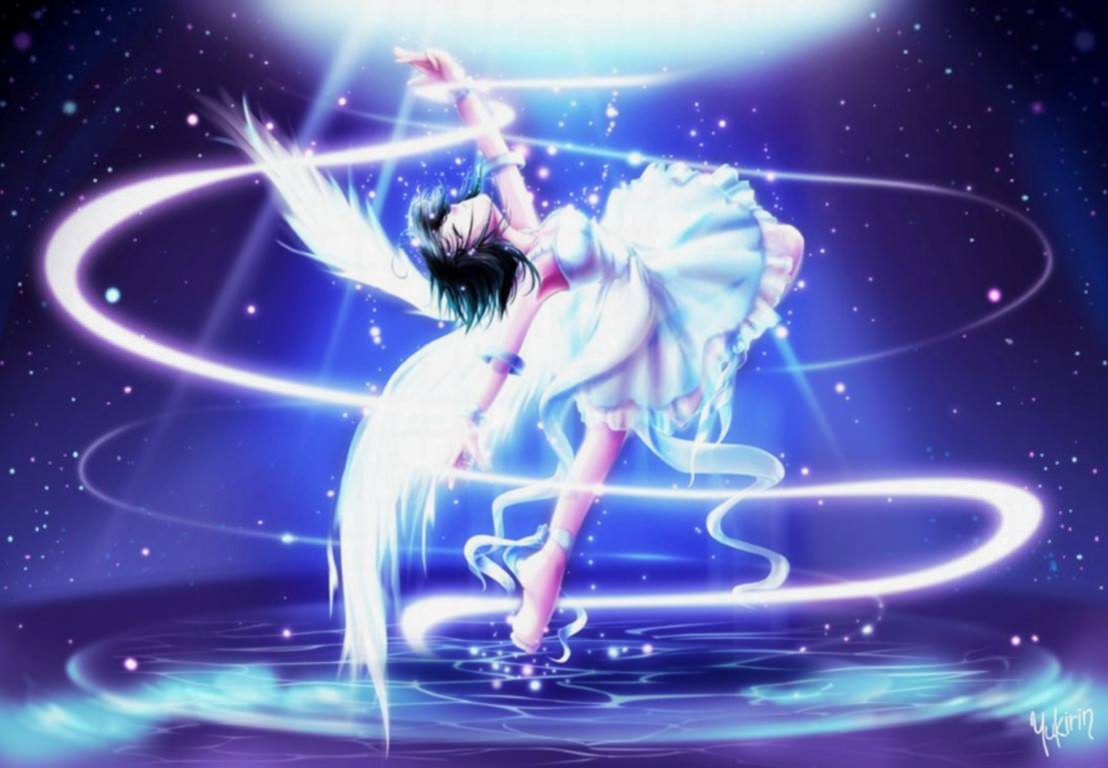 Танец ангела, девушка ангел в белоснежном платье, с белыми крыльями танцует на воде под светом звезд и лучей.