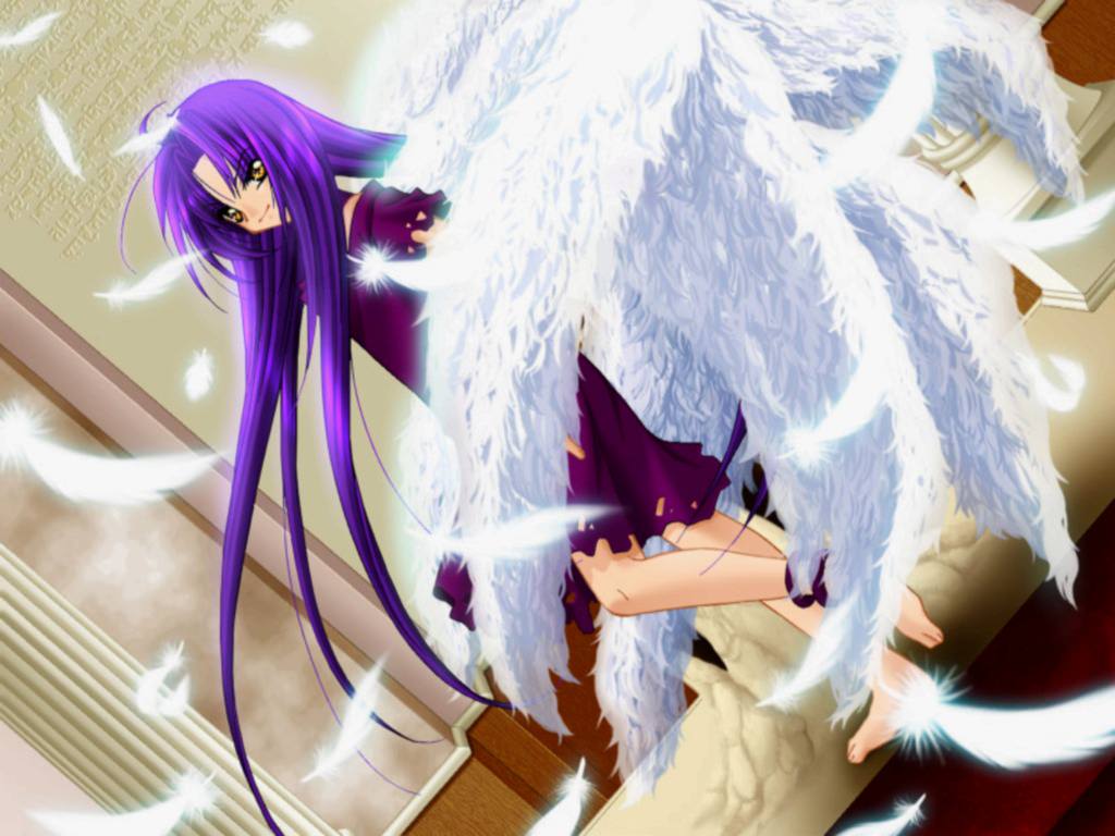 Коварный ангел, коварная девочка ангел с длинными фиолетовыми волосами, пернатые большие белые крылья.