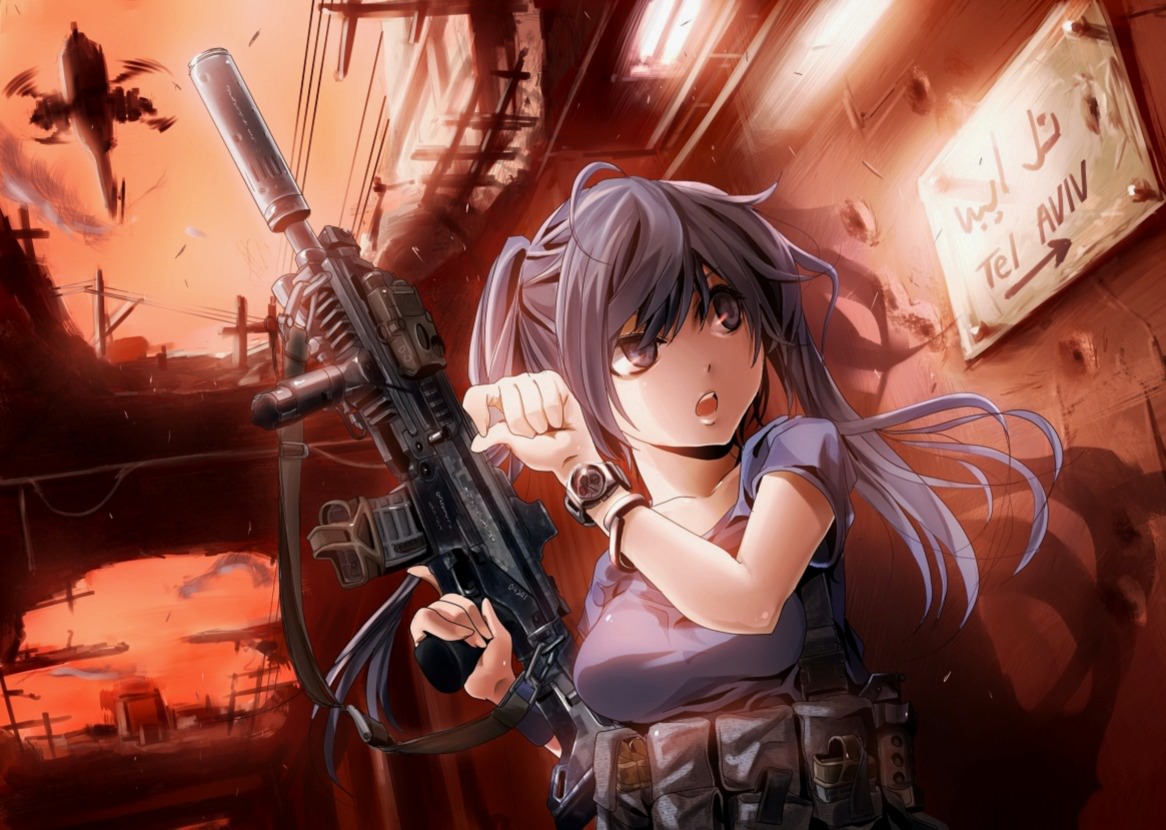 Девушка из отряда повстанцев, красивая боевая девушка с автоматом в руках, глушитель на оружии, война в Tel Aviv, разрушенные строения, вертолет.