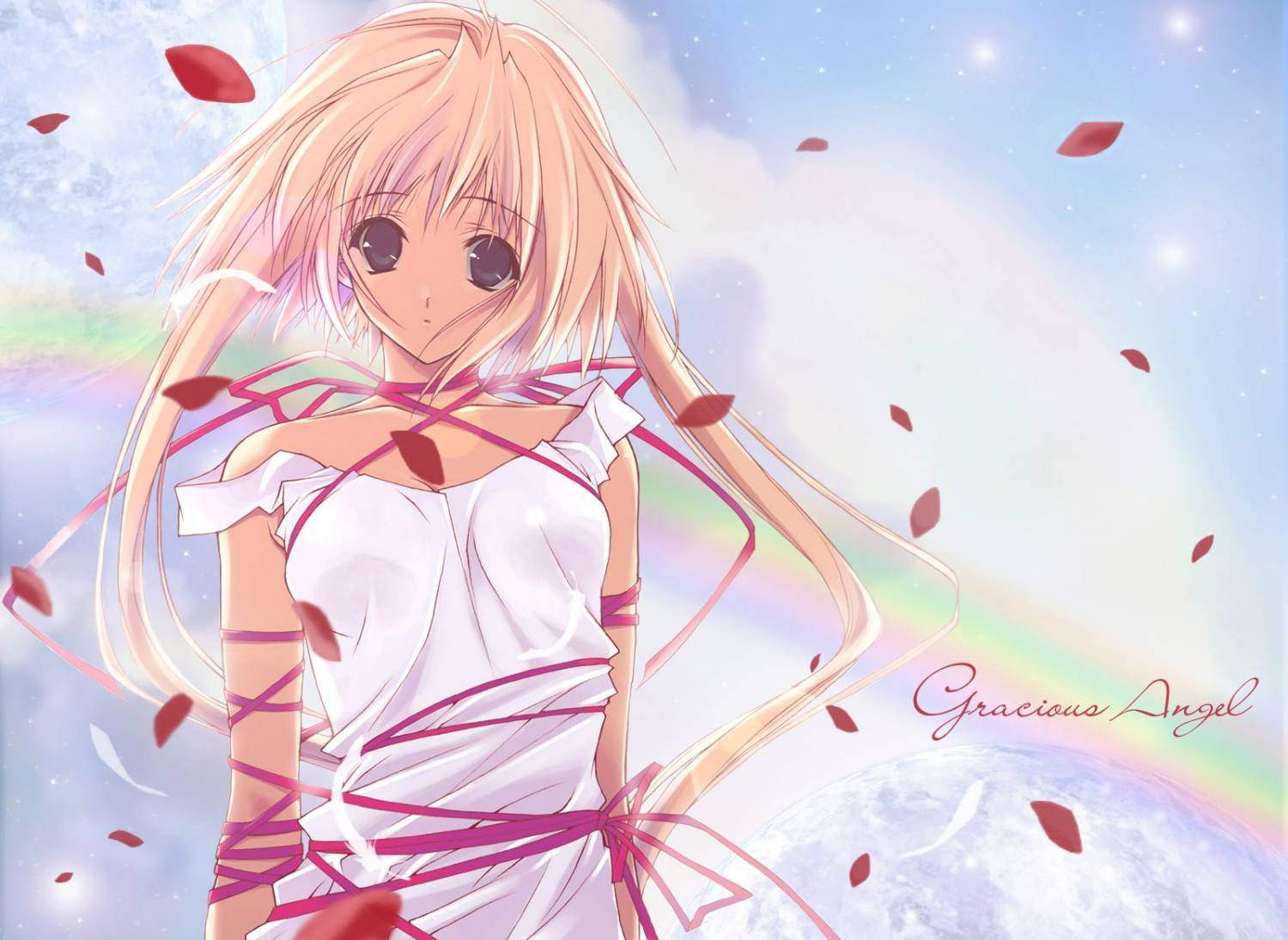 Прекрасная и светлая девушка словно ангел, красивая аниме девушка в белом "легком" платье и светлыми волосами на фоне радуги в облаках, красные лепестки и звезды.