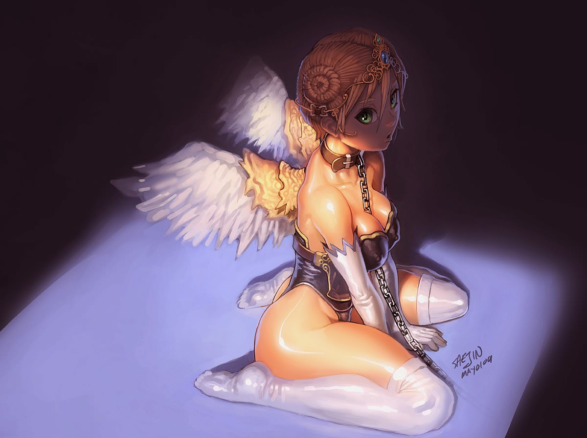 Соблазнительный ангел в чулках, девушка ангел с сексуальными формами, в позолоченном металлическом корсете, в белых латексных чулках, с красивой грудью, с маленькими белыми крыльями сидит на полу, на поводке.