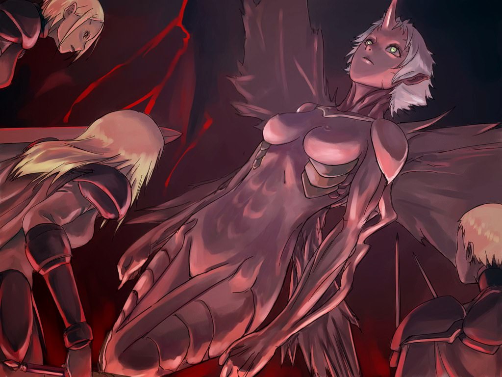 Пробудившаяся Присцилла и клейморы у кратера вулкана, Мириа, Хэлен и Дэнёв окружили однорогого демона Присциллу, демонесса с крыльями, claymore anime.