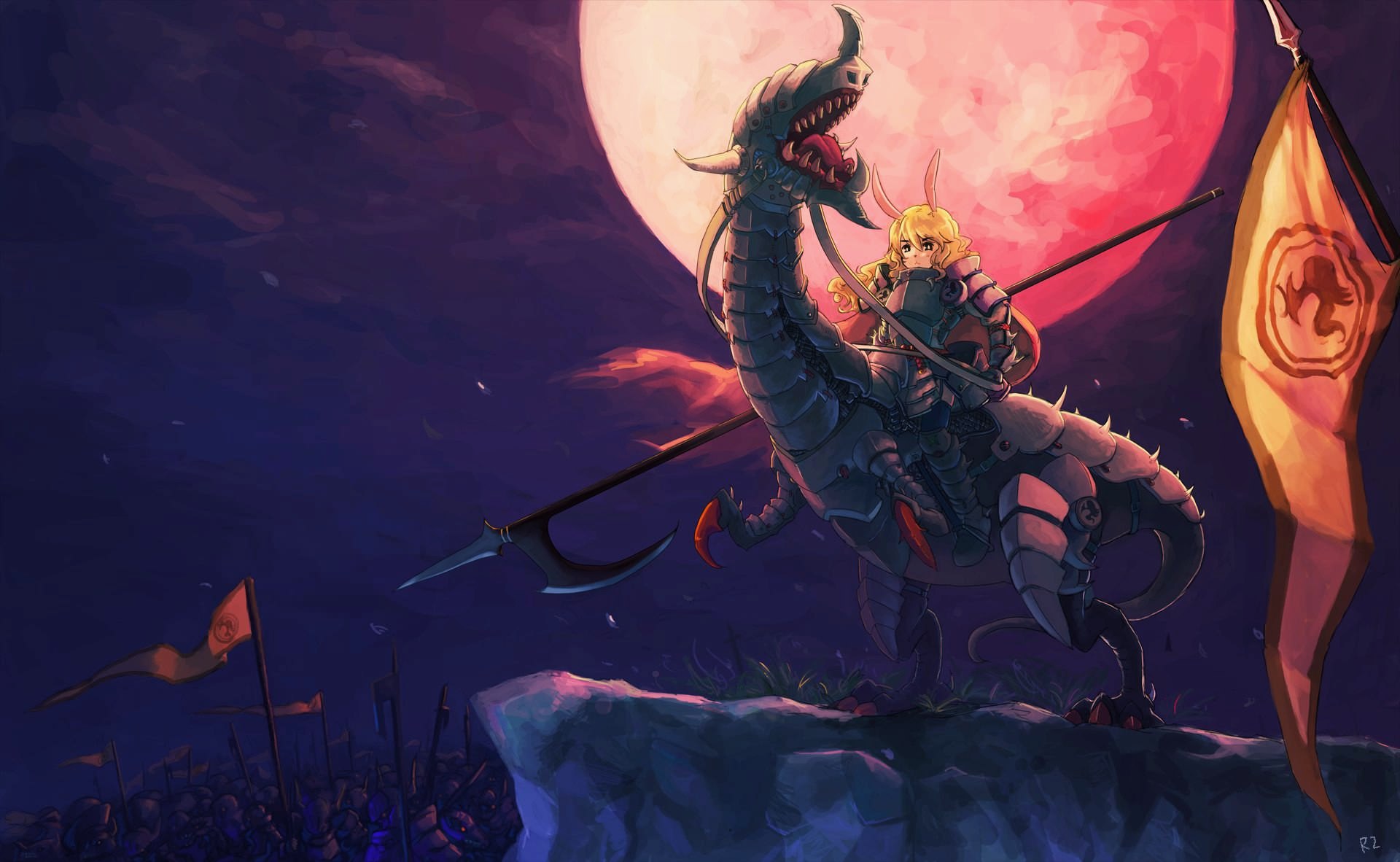 Девочка с копьем на драконе, юная воительница с длинным и острым копьем оседлала ручного дракона и отправилась на битву под покровом ночи и красной луны, ночное сражение.