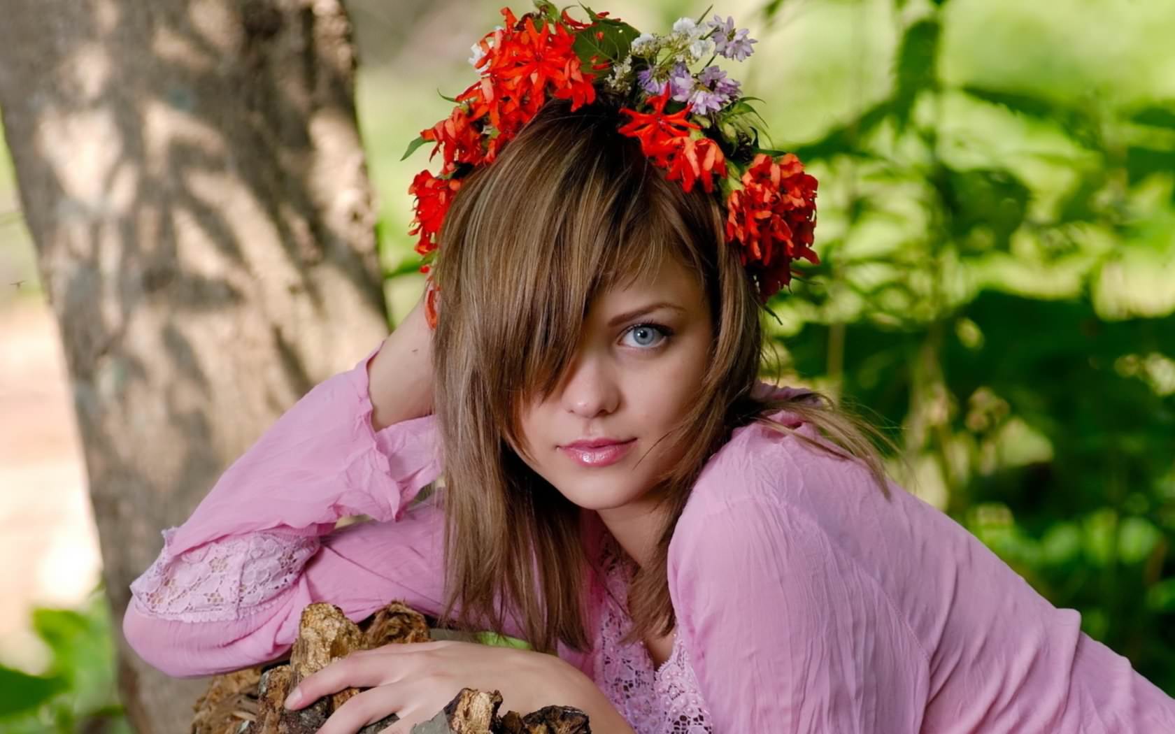 голубые красивые глаза, цветы на голове, девушка в розовой блузке в летнем саду, justgirls (44).