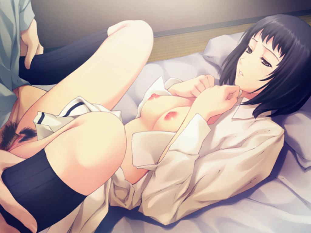 Секс с брюнеткой в гольфах, парень нежно трахает брюнетку без трусиков на кровати, расстегнутая рубашка и обнаженная грудь, раздвинутые ножки.