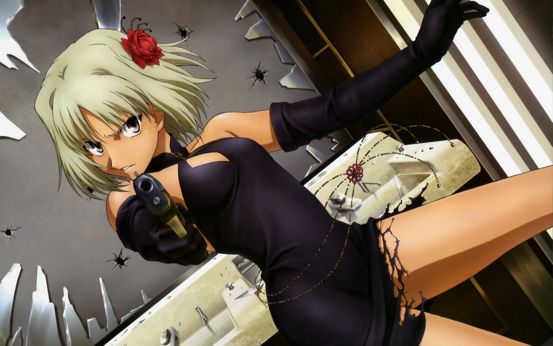 Молодая дама с пистолетом, красивая девушка в обтягивающем черном платье, порванным снизу, в длинных перчатках, красивые ножки, блондинка с розой в волосах, разбитое зеркало в ванной, девушка с пистолетом в руке.