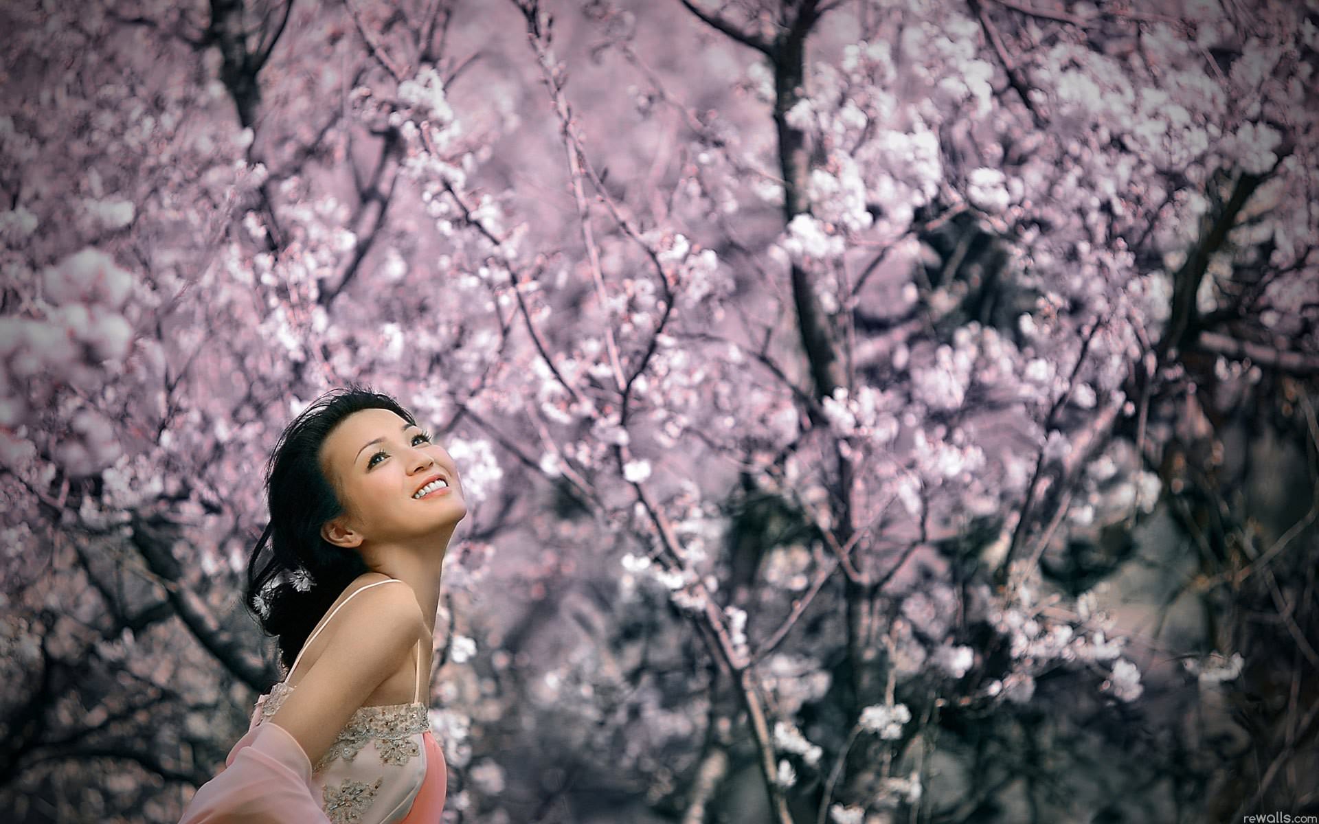 Японка радуется сакуре, азиатка в японском саду, розовые лепестки сакуры.