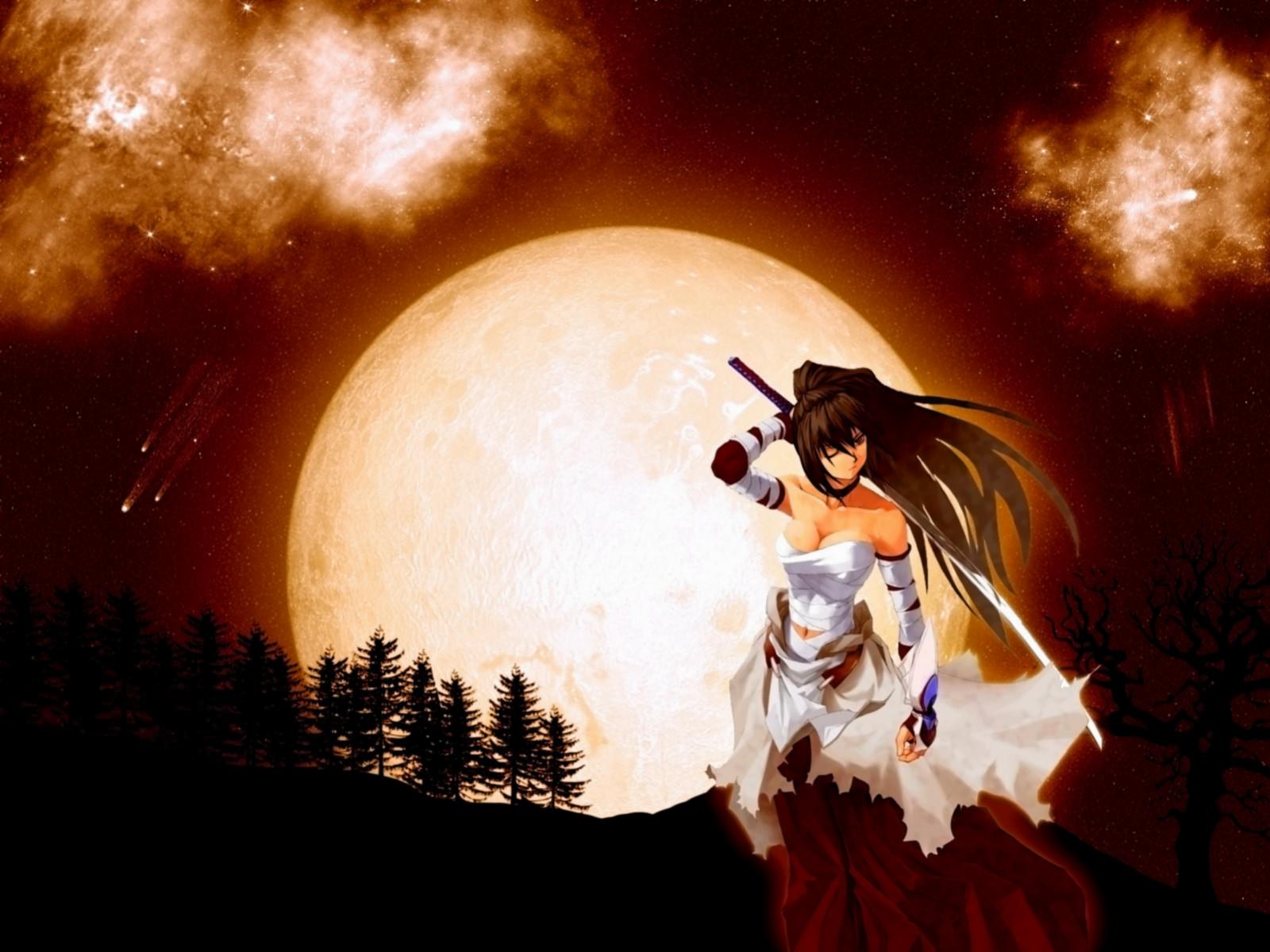 Девушка самурай на фоне красной луны, воительница с длинной катаной в темном лесу, огромная яркая луна.