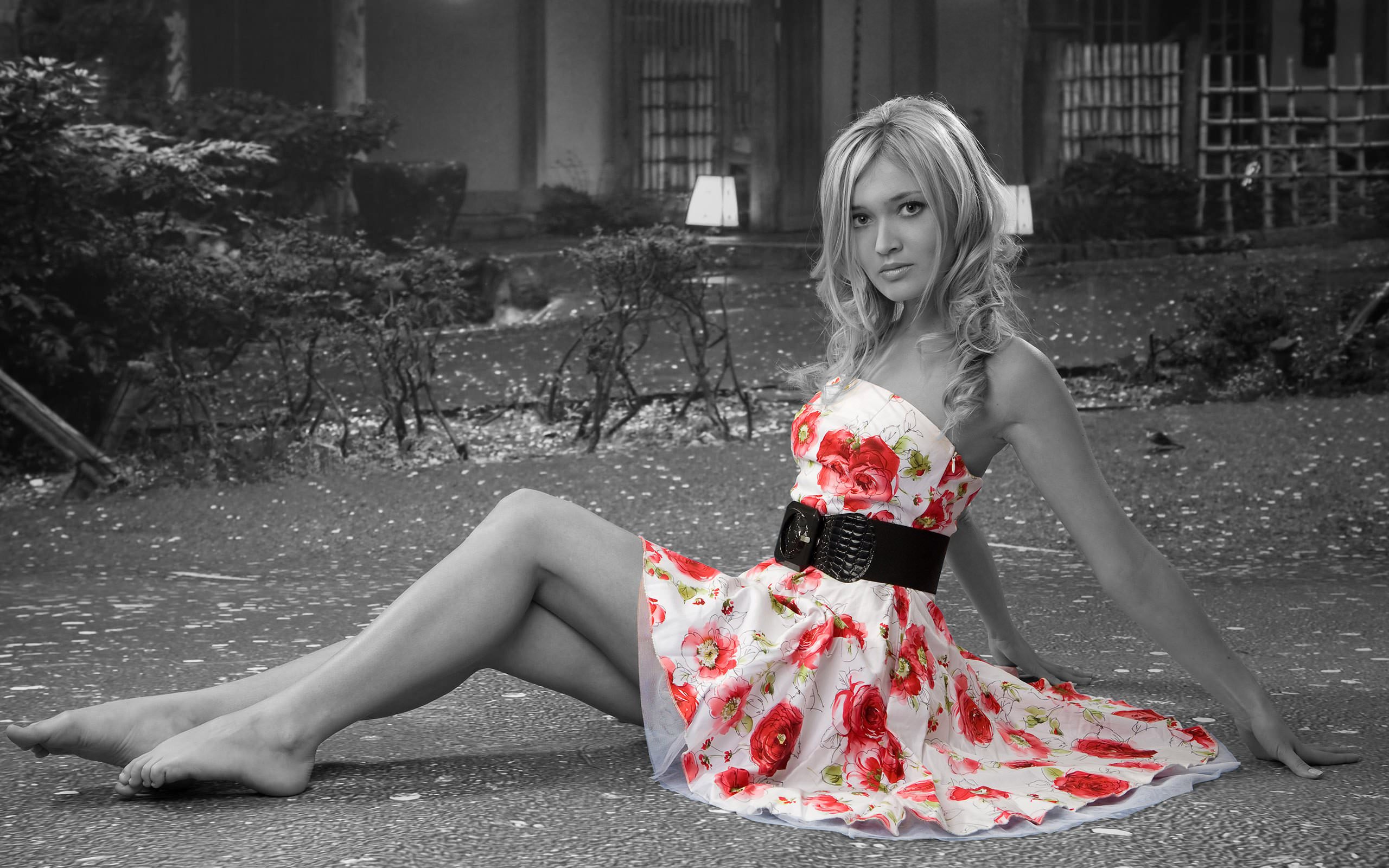 Красивая, девушка, в, ярком, светлом, летнем, платье, с, ремнем, нежные, ножки, сидит, на, асфальте, во, дворе, дома, justgirls, (100)