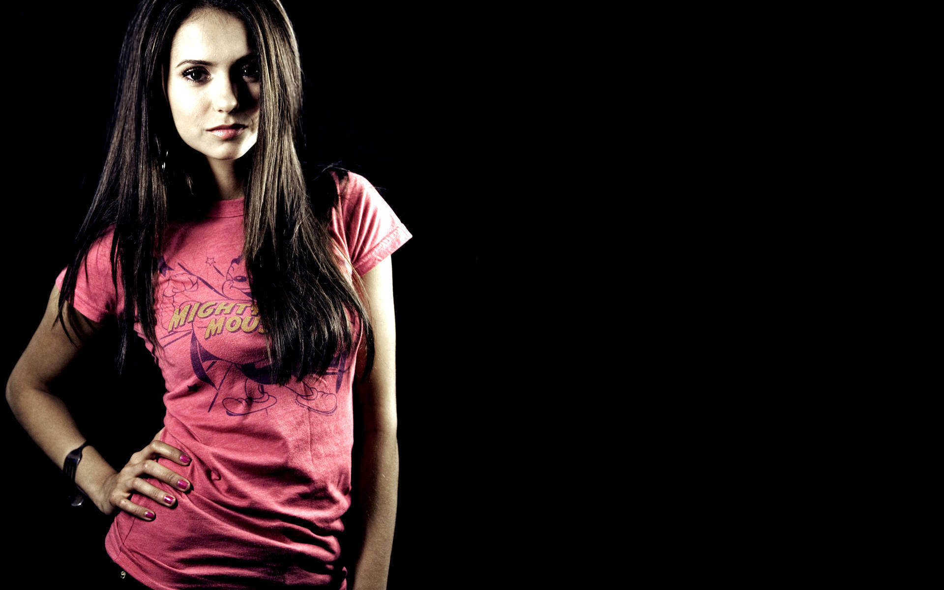 Нина Добрев в розовой футболке на черном фоне, красивая стройная девушка с темными волосами, justgirls (105).