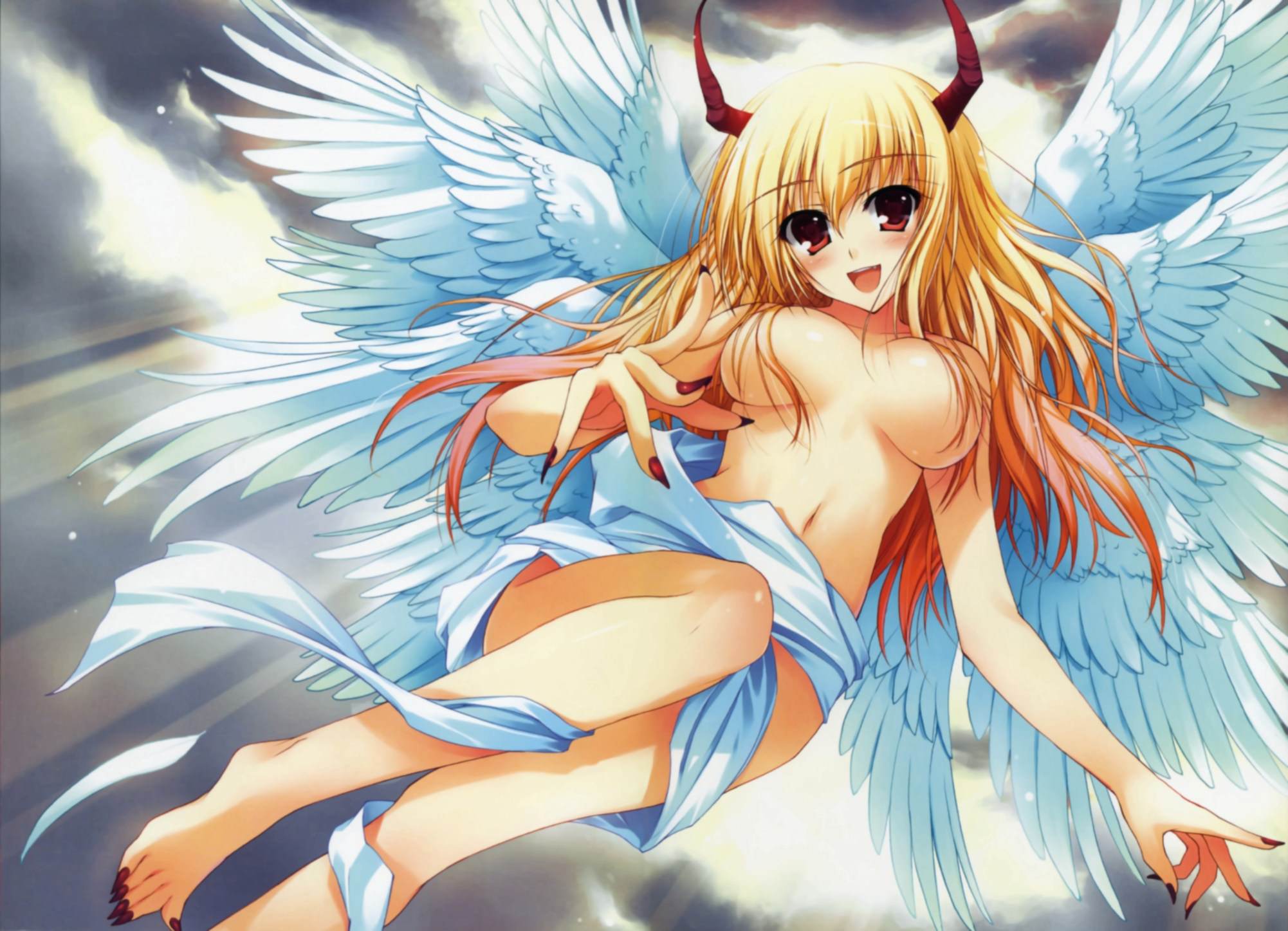 То ли ангел, то ли демон. Полуобнаженная девушка с множеством ангельских крыльев за спиной и красными рогами на голове, блондинка ангел в небесах.