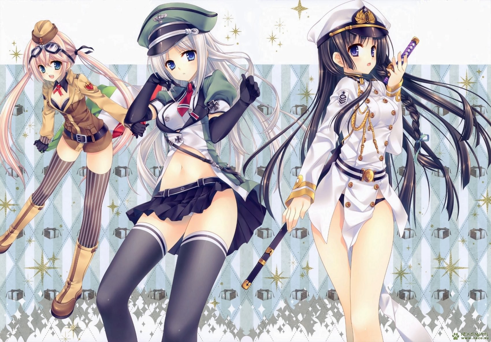 Красивые девушки в военной форме, в юбках, в чулках, в фуражках.