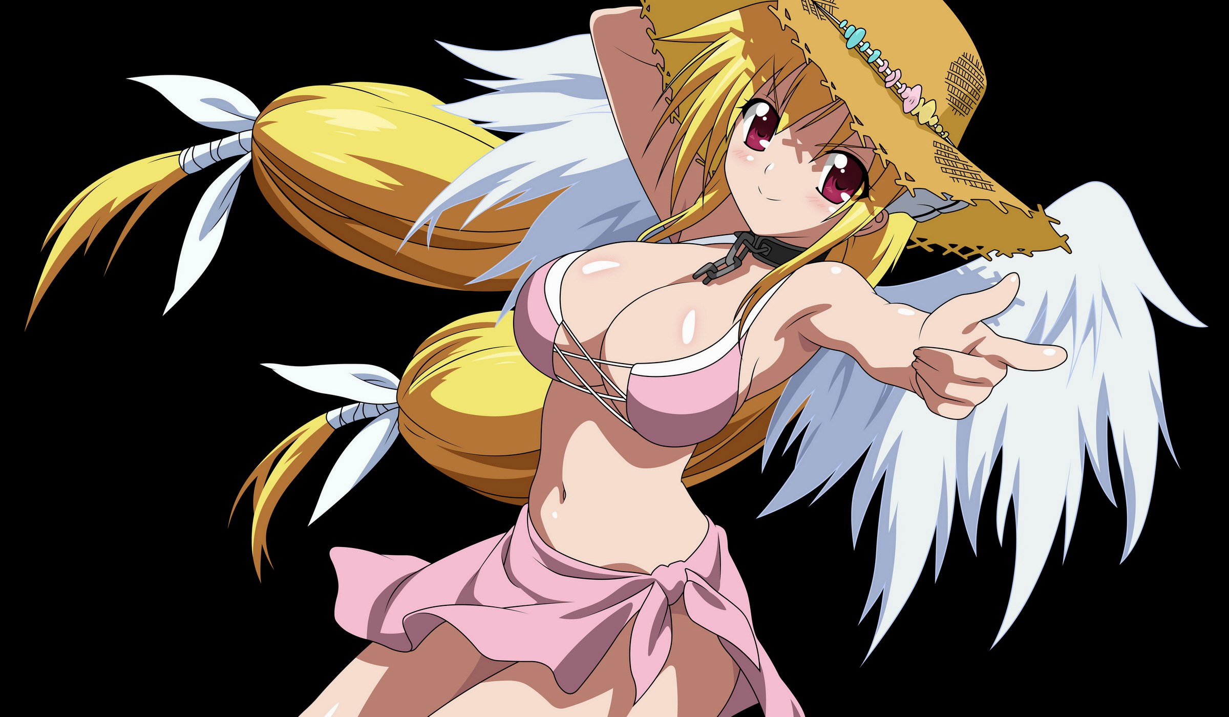 Ангел в соломенной шляпке с большой грудью в розовом лифчике, девушка ангел с объемными косами в розовой мини юбке, с маленькими ангельскими крыльями.
