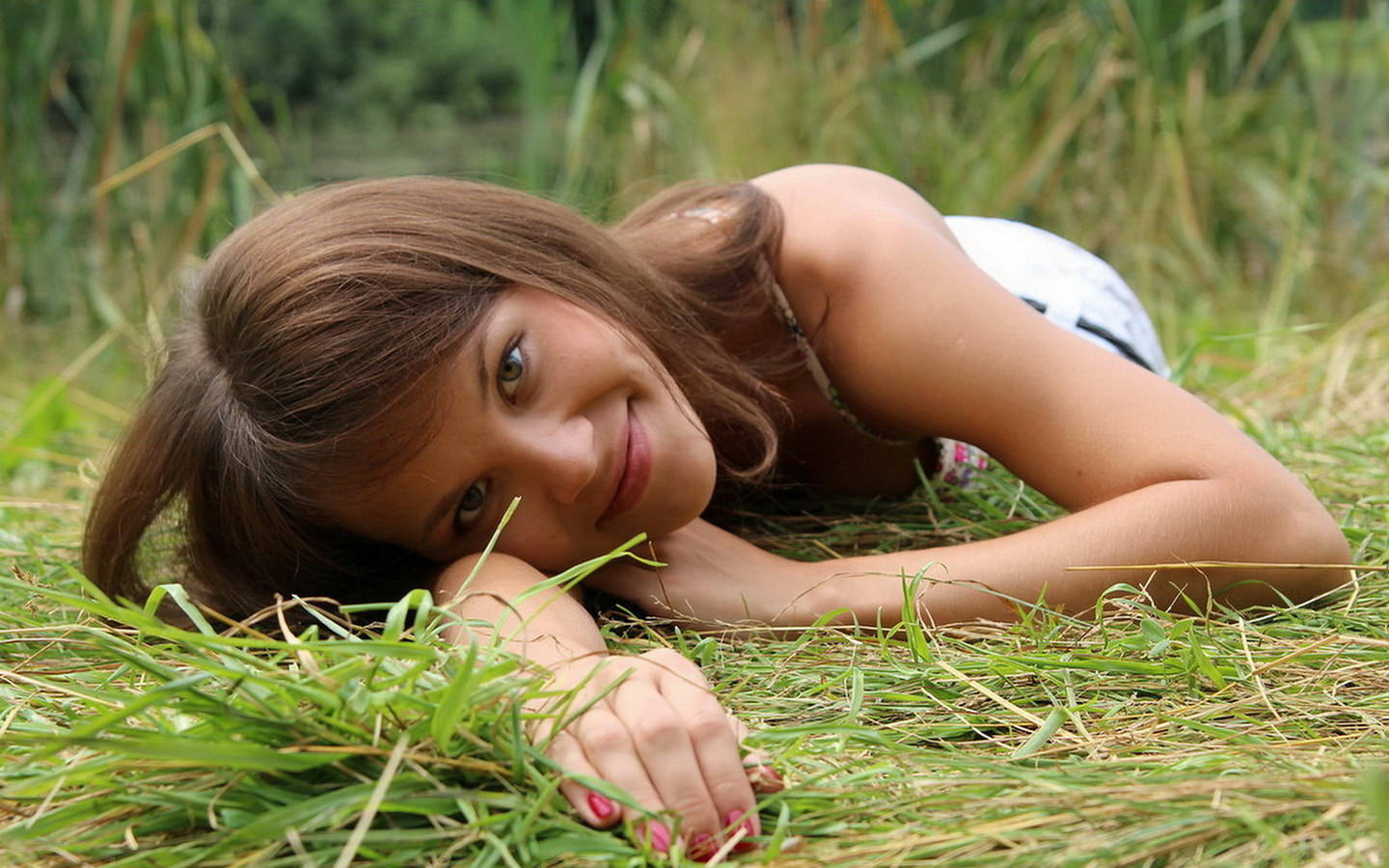 Лежит на траве и мило улыбается, красивая брюнетка, валяется на травке, в сарафане.