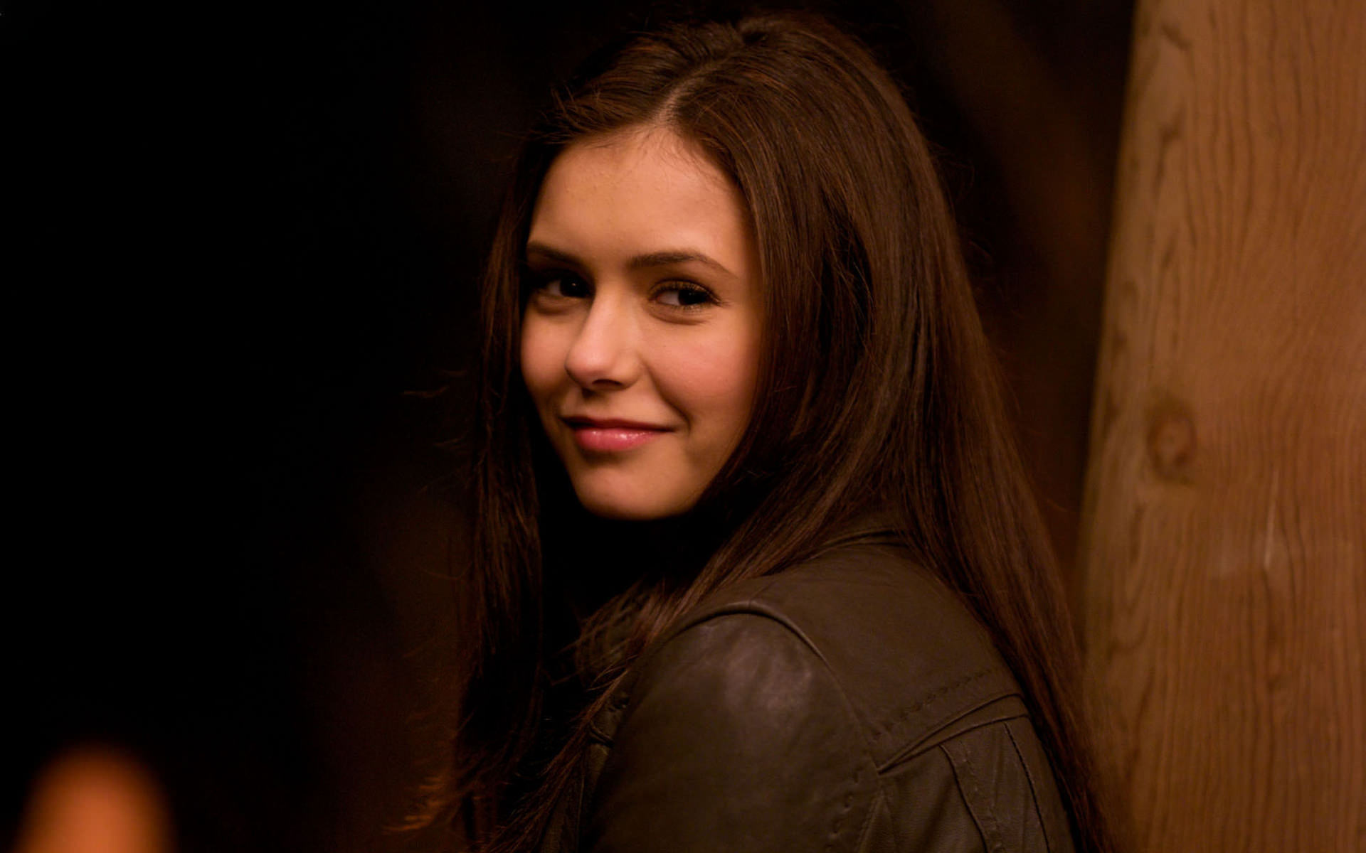 Очаровательная улыбка у брюнетки, милое лицо и взгляд.