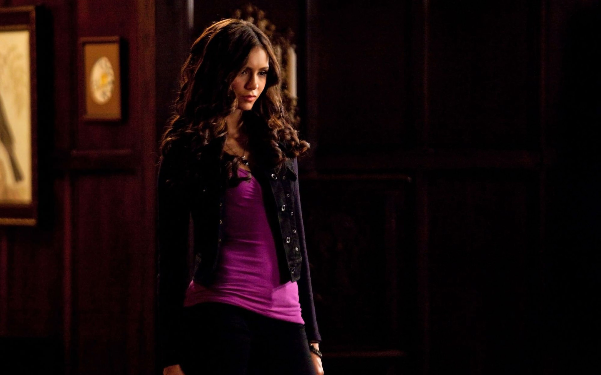 Нина Добрев во время съемок, красивая NINA DOBREV, в фиолетовой футболке.