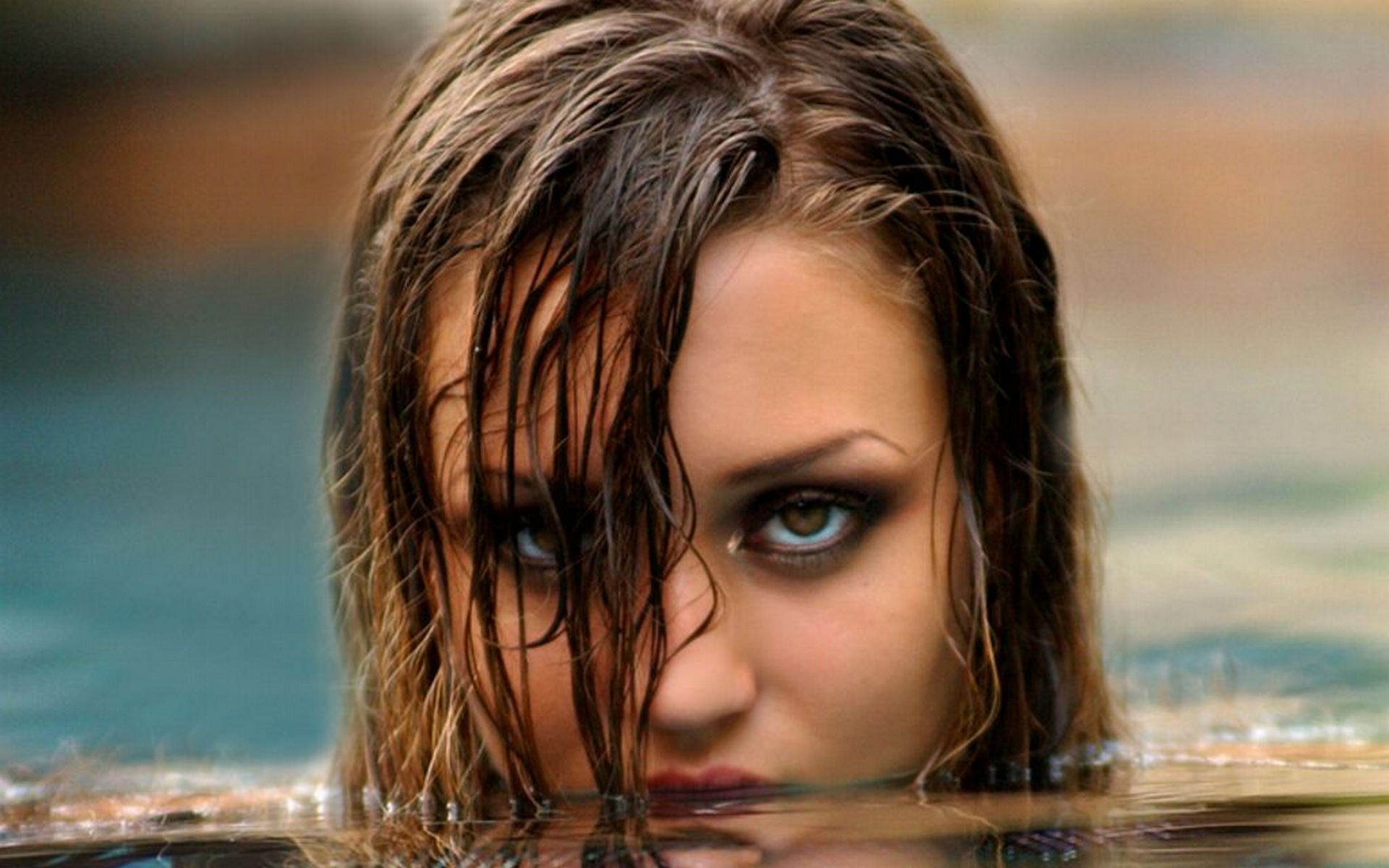 Кареглазая девушка смотрит из воды, сексуальный взгляд, мокрые волосы, купается в воде.