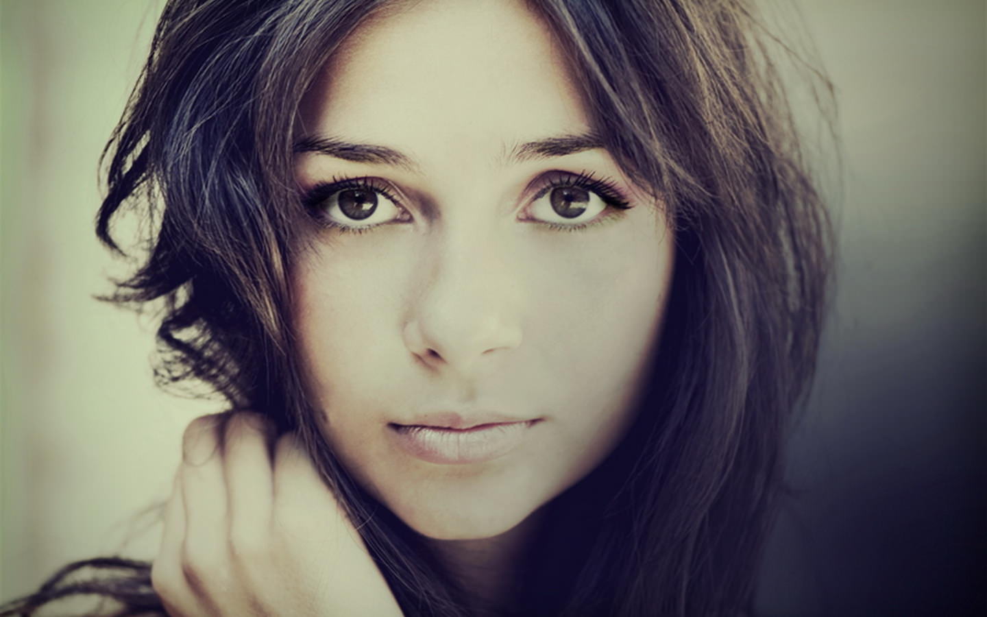 Милый взгляд красивой брюнеточки, красивое лицо брюнетки, очаровательные глаза.