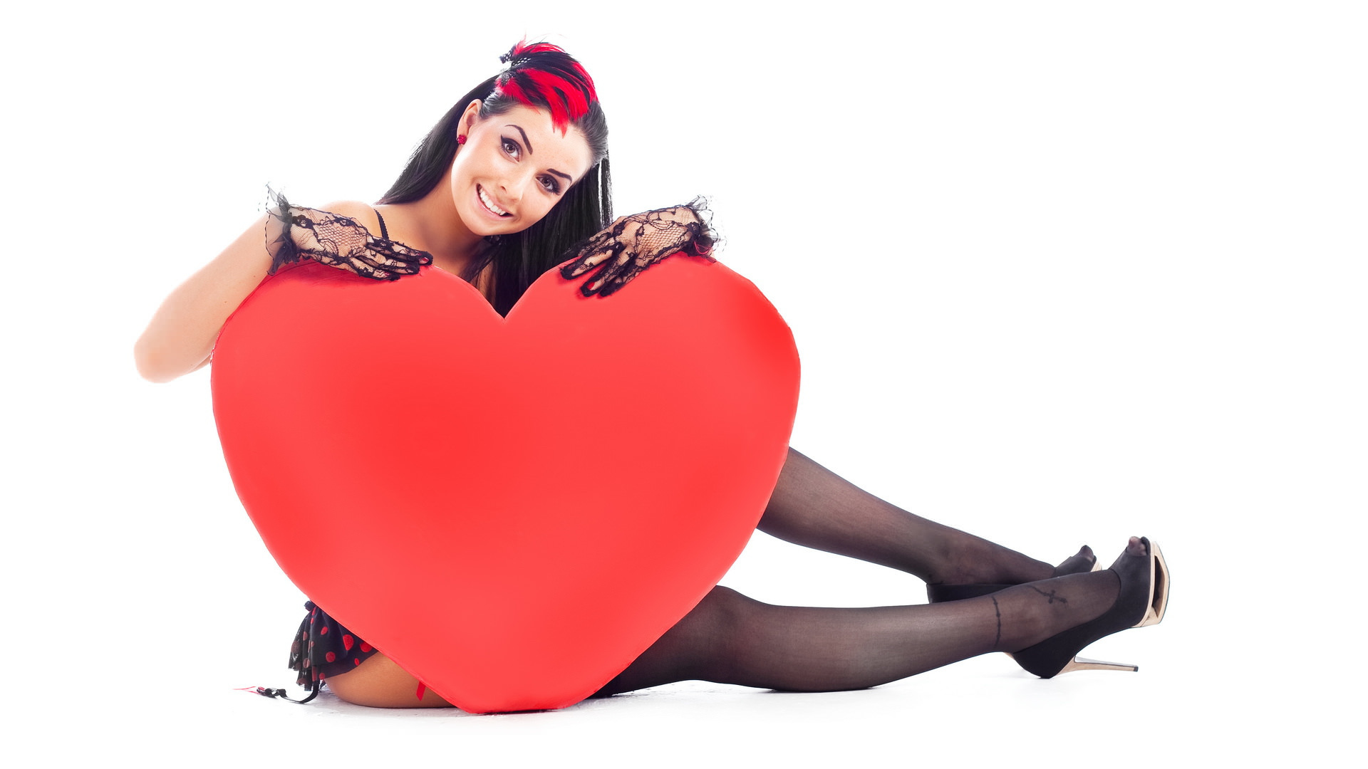 Брюнетка и красное сердце, спряталась за сердце, улыбается, в красивом белье и чулках.