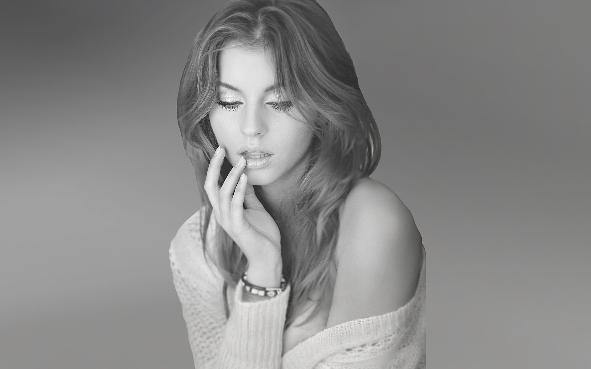 Красивая девушка в "черно-белом" стиле, в теплой кофте, слегла приоткрыла рот, нежно касается пальцем кончик рта.