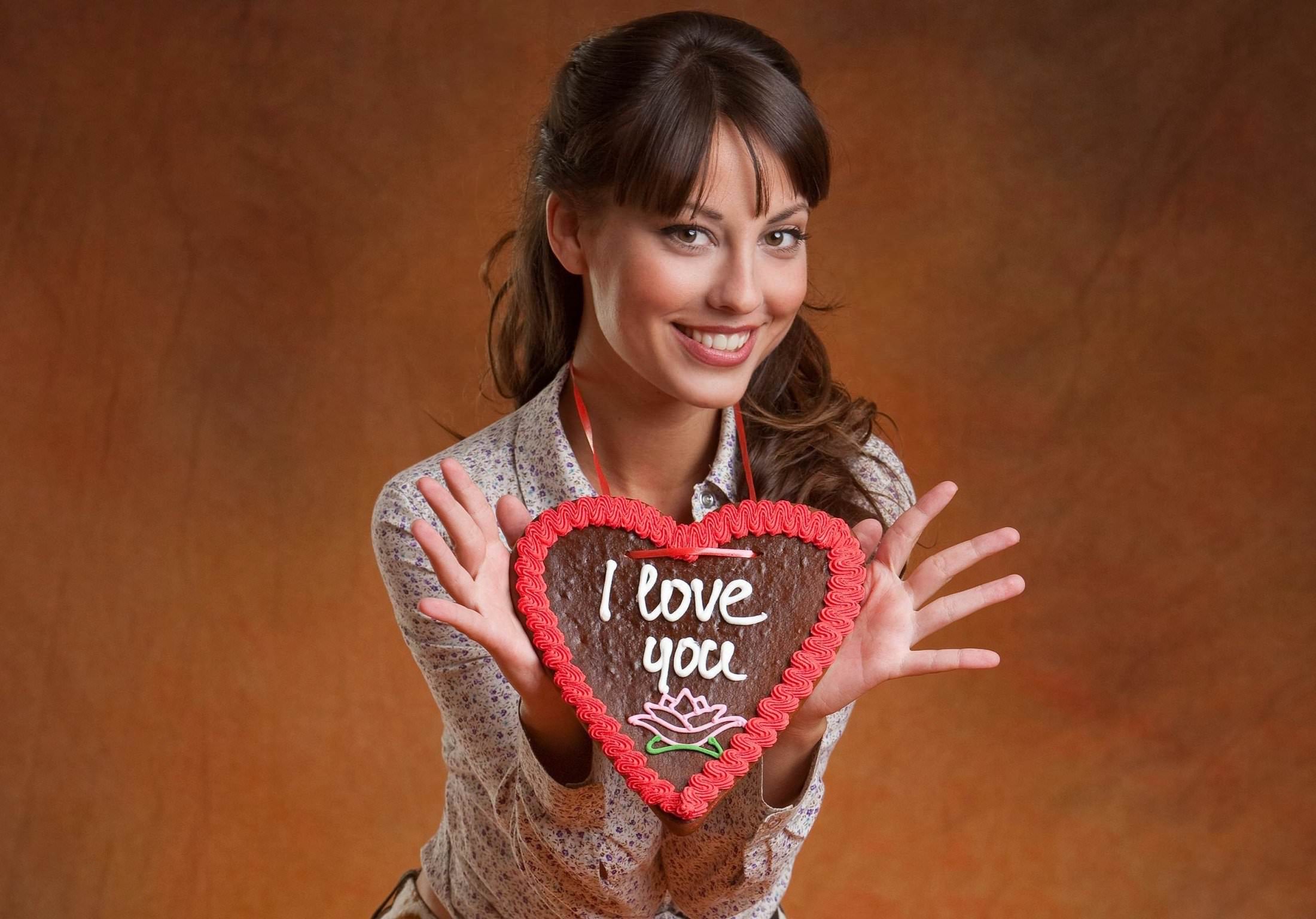 Мило улыбается с "сладким медальоном" на шее, сердечко "i love you" красивая девушка.