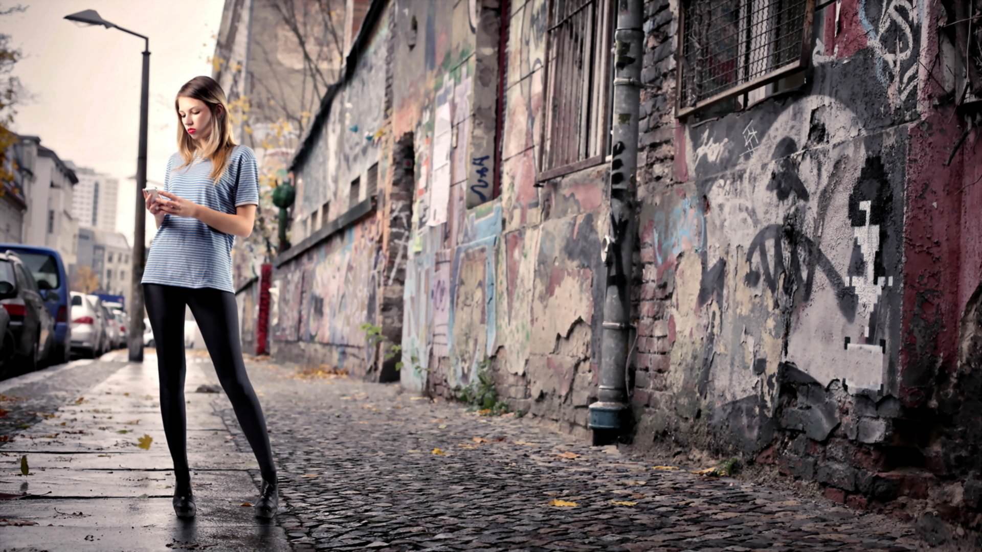 Красивая девушка на мрачной улице, в легинсах, в руках телефон, осень.
